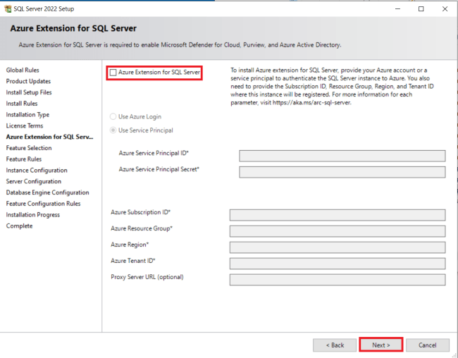 In the screenshot below I’ve unchecked “Azure Extension for SQL Server”. But I can always come back and install it later. If you want to install the extension, check “Azure Extension for SQL Server” and either select the “Use Azure Login” Radio button and login in to your Azure account or enter a Service Principle ID and Secret. Click Next to continue.