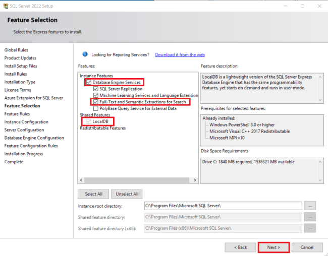 My screen also shows I already have an instance of LocalDB installed. But make sure to check it if you haven’t installed it yet and click Next.