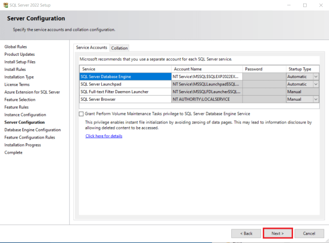 On the Server Configuration Screen, leave the default accounts and click Next.