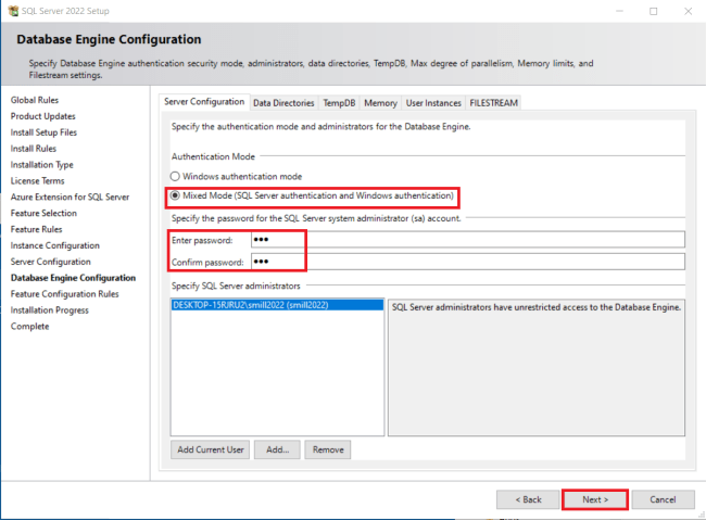 On the Database Engine Configuration screen, select Mixed Mode and enter a password for the sa (System Administrator Account) so you’ll be able to login in via windows authentication or the sa account.