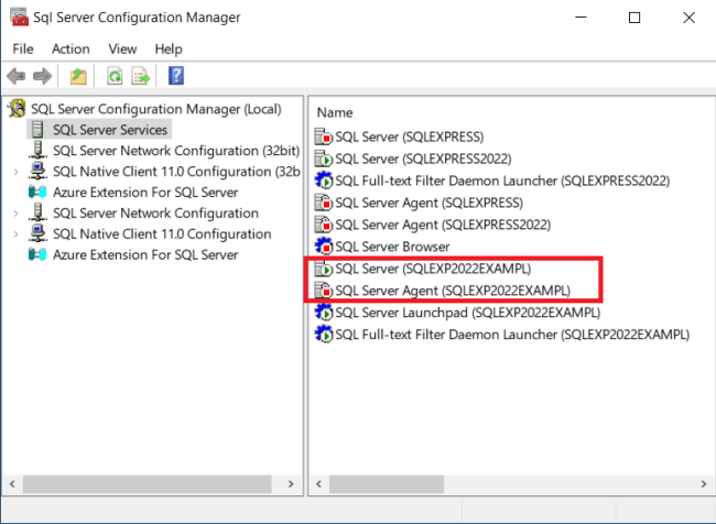 Once SQL Server Configuration Manager starts up you should see the new SQLEXP2022Exampl instance show up next to any other existing instances.