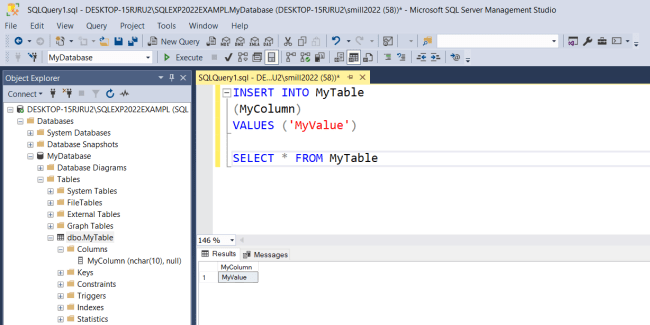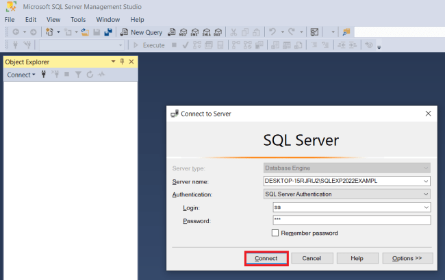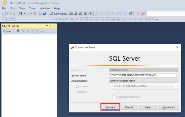 Now we can finally connect to our SQL Server Express 2022 “Exampl” instance we created earlier.