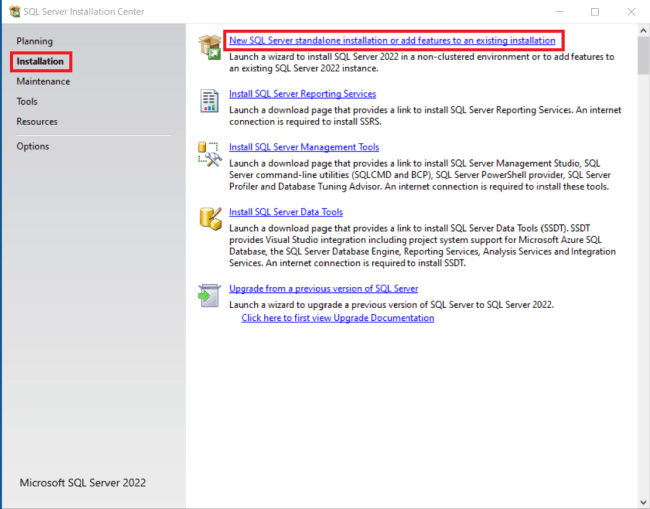 Once the SQL Server Installation Center starts up, select Installation on the left hand side, and click “New Sql Server standalone installation or add features to an existing installation” on the right hand side.