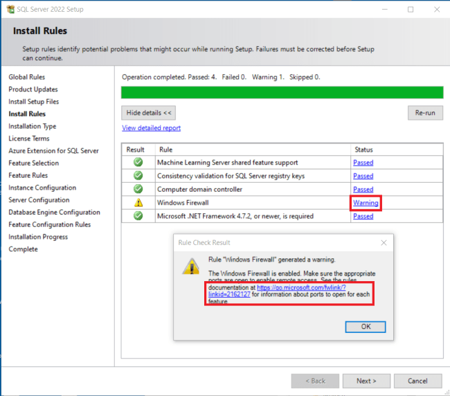 Next the Install Rules will show any errors that need to be fixed. If you get a firewall warning click the Warning link for that rule and the “Rule Result” dialogue will pop up. From there click the Microsoft link to go out and read on how to open the required ports in your firewall.